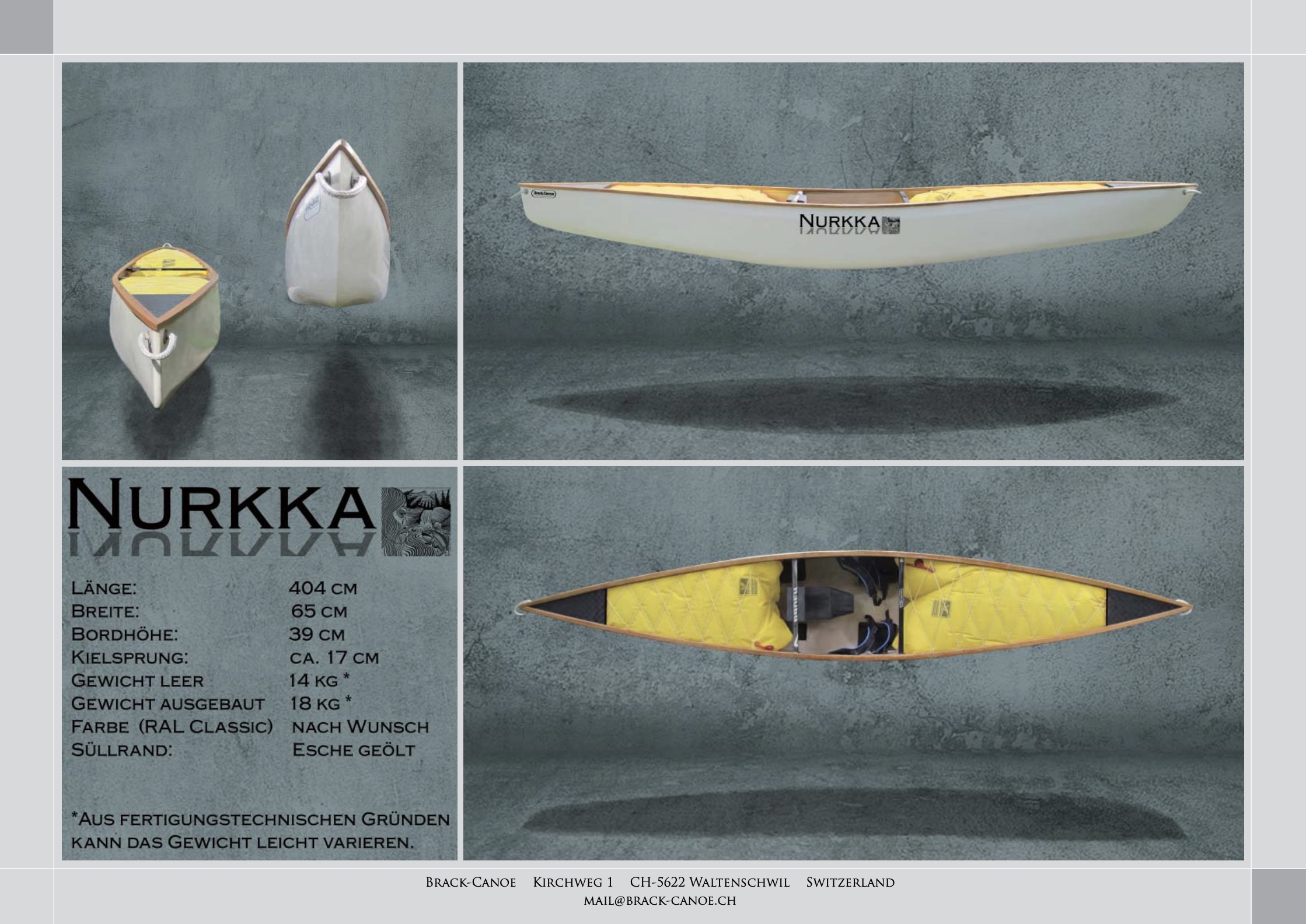 | Nurkka – Offener Wildwasser-Slalomkanadier | Inspiriert vom legendären offenen Wildwasser-Slalomkanadier „Edge“, kombiniert der Nurkka altbewährte, kantige Formen mit einer innovativen, leichten Bauweise und persönlichen Präferenzen des Bootsbauers Peter Brack. Mit dem Nurkka ist das Fahren um die Slalomstangen eine wahre Freude. Zum einen ermöglichen der Kielsprung und die ausgeprägten Kanten eine ausserordentliche Wendigkeit und zum anderen lassen die Länge und das geringe Gewicht ein ungeahntes Beschleunigen und Tempo zu. | ![]() |